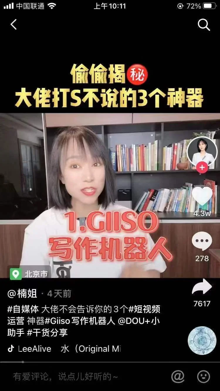 智搜首选抖音平台,以运营、短视频工具为切入点,精选若干个运营类账号合作,致力于为用户提供学习干货知识分享,从而打造爆款短视频在KOL账号种草带动下,一批中小素人账号自发推广,形成联动效应精耕行业开新花2021年已过半,Giiso写作机器人持续提升产品,注重用户体育提升。