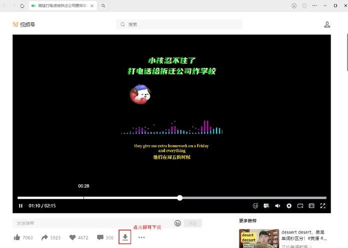 打开微信 PC 端,使用点击需要下载的视频,在视频下方的操作按钮一栏,会多出一个下载按钮,如下所示