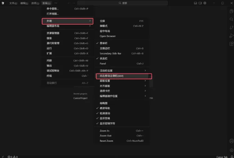 最近cursor感觉自己使用熟悉了,但乱点击导致侧边栏一直在顶部,我们该如何恢复布局?